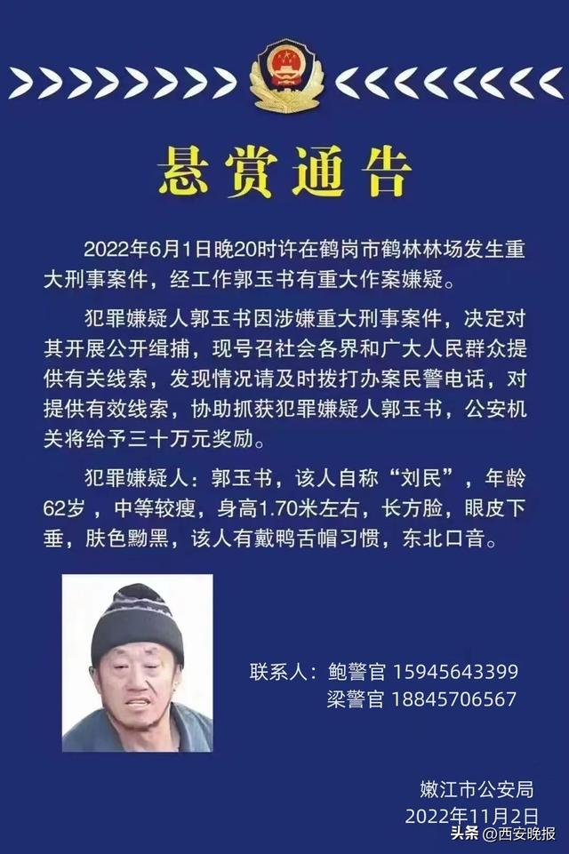 2022年6月1日晚20时许,在鹤岗市鹤林林场发生重大刑事案件,经工作郭玉书有重大作案嫌疑。对提供有效线索,协助抓获犯罪嫌疑人郭玉书,公安机关将给予30万元奖励。