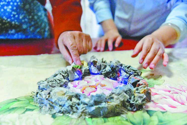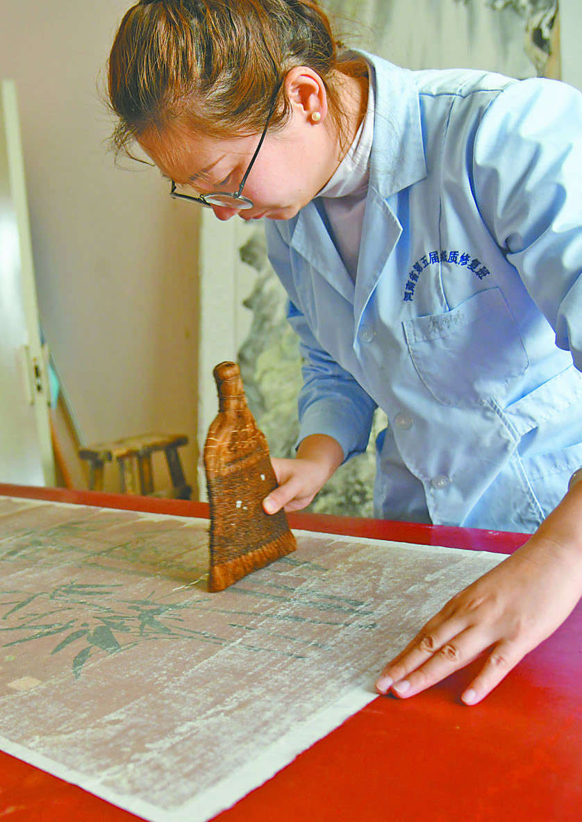 “这个活儿真让人战战兢兢,如果一幅保存了几百年的字画毁在了我手里,那心里真不是滋味。所以,修补时啥都不要管,只专注在画上。光这一份地契,我就弄了十几天。它太薄了,太脆了,不敢水洗,得先用两张皮纸夹住它,再小心翼翼地喷水,将它‘焖’起来,最后再用专用的镊子一点点除去里面的病害。这个活儿可比当裁缝难多了,当裁缝,错个针脚顶多衣服难看些。可我不敢错,一旦错了,那可真是罪过。”跟着婆婆学了5年的技艺,张雁娜早已明白了肩上的责任。