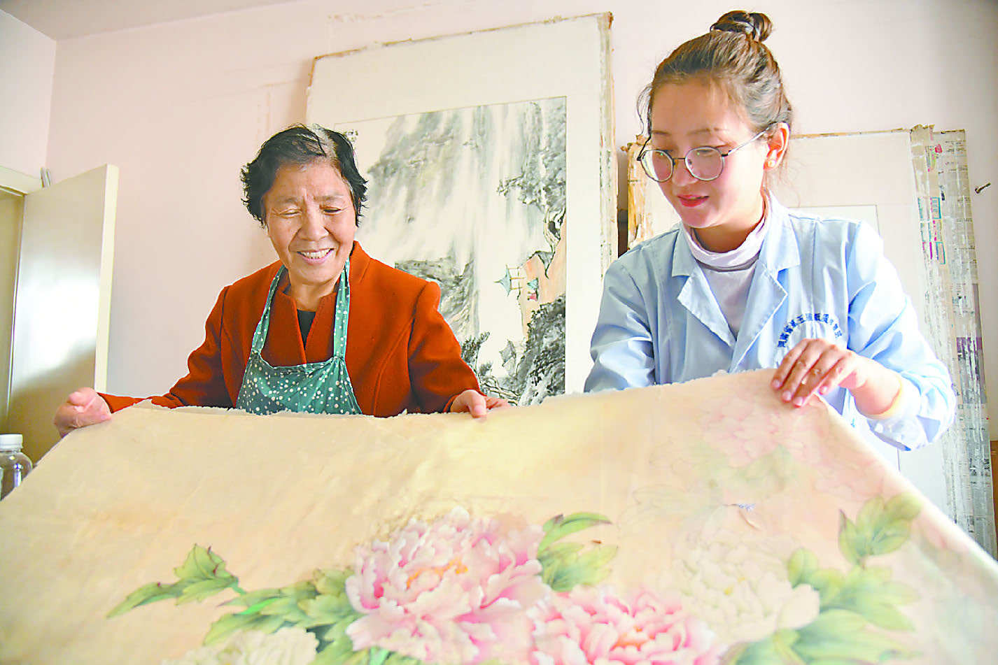 图① 孙艳琳(左)正在指导张雁娜(右)修复一幅字画。