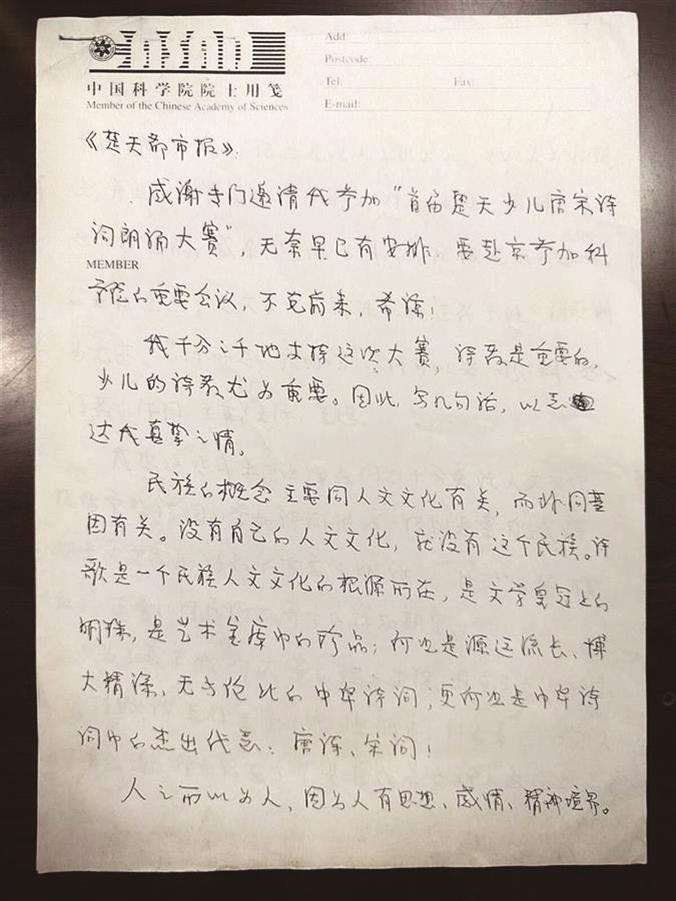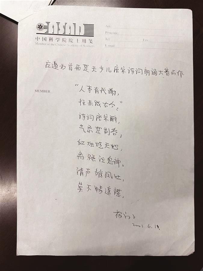回顾与杨叔子校长的交集,大致有三事。一是我和张震龙、刘草施、郑小平等同学在华工硕士毕业时,杨校长亲临为我们硕士帽拨穗、颁发毕业证并合影留念。二是我在办都市报时,特约刊发杨叔子先生传记,校长应承自撰一百则小故事连载,可拟出纲目后因健康缘故终未成事。三是先生应邀参加首届“楚天少儿诗词朗诵大赛”决赛现场评审,先生因故不能到场,但特地为此赋诗:“‘人事有代谢,往来成古今’。诗词唐宋醉,气象荆楚呑。红烛烧天地,离骚泣鬼神。清声雏凤吐,莫不畅遥襟。”先生昂扬不老的激情,令我和全体评委及全场学童、家长深为感动。