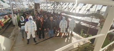 “我们的船员穿好防疫服,一个一个将救生筏上的船员拉上了甲板,将他们安顿在船舱里。”李信杨说,经过半小时努力,48名船员顺利上船。