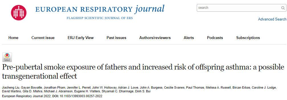 发表在《欧洲呼吸杂志》的研究表明,在父亲15岁以前,祖父母吸烟造成的二手烟暴露,与隔代子女患非过敏性哮喘的风险提高59%有关。