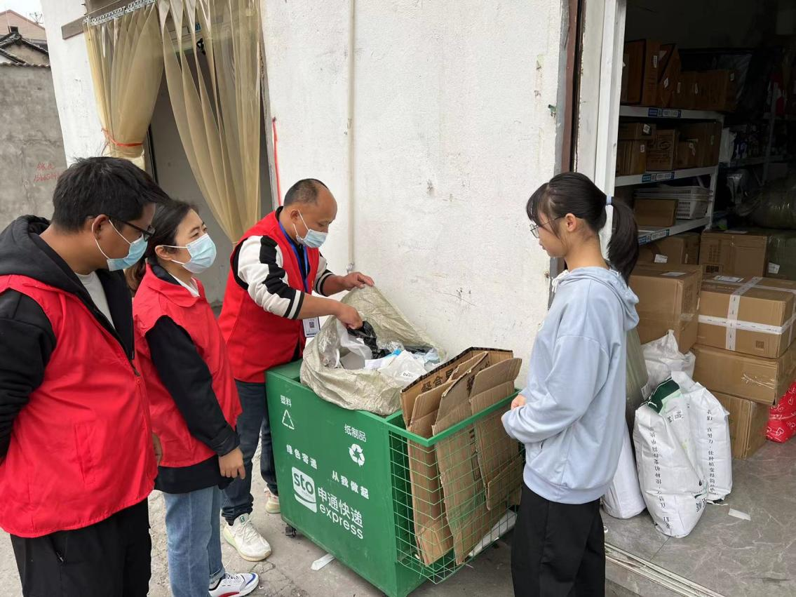 活动当天,景树村垃圾分类党员志愿们走访了辖区内各家菜鸟驿站。通过发放垃圾分类宣传册、张贴垃圾分类宣传贴的形式,协助菜鸟驿站工作人员更好地了解垃圾分类工作。通过对照宣传册及宣传贴上的分类依据及常见的种类,深入浅出得向菜鸟驿站工作人员以及周边来取件的群众众普及垃圾分类知识。“小姑娘,你听我说。你看你拿这么多快递,外包装拿回去拆很占体积的,垃圾桶一下就装满了。你直接在菜鸟驿站拆掉,外包装呢可以投到外面的分类回收箱里去,这样你也方便,还可以保护环境你!”党员志愿者对一位来取件的女士这样说道。