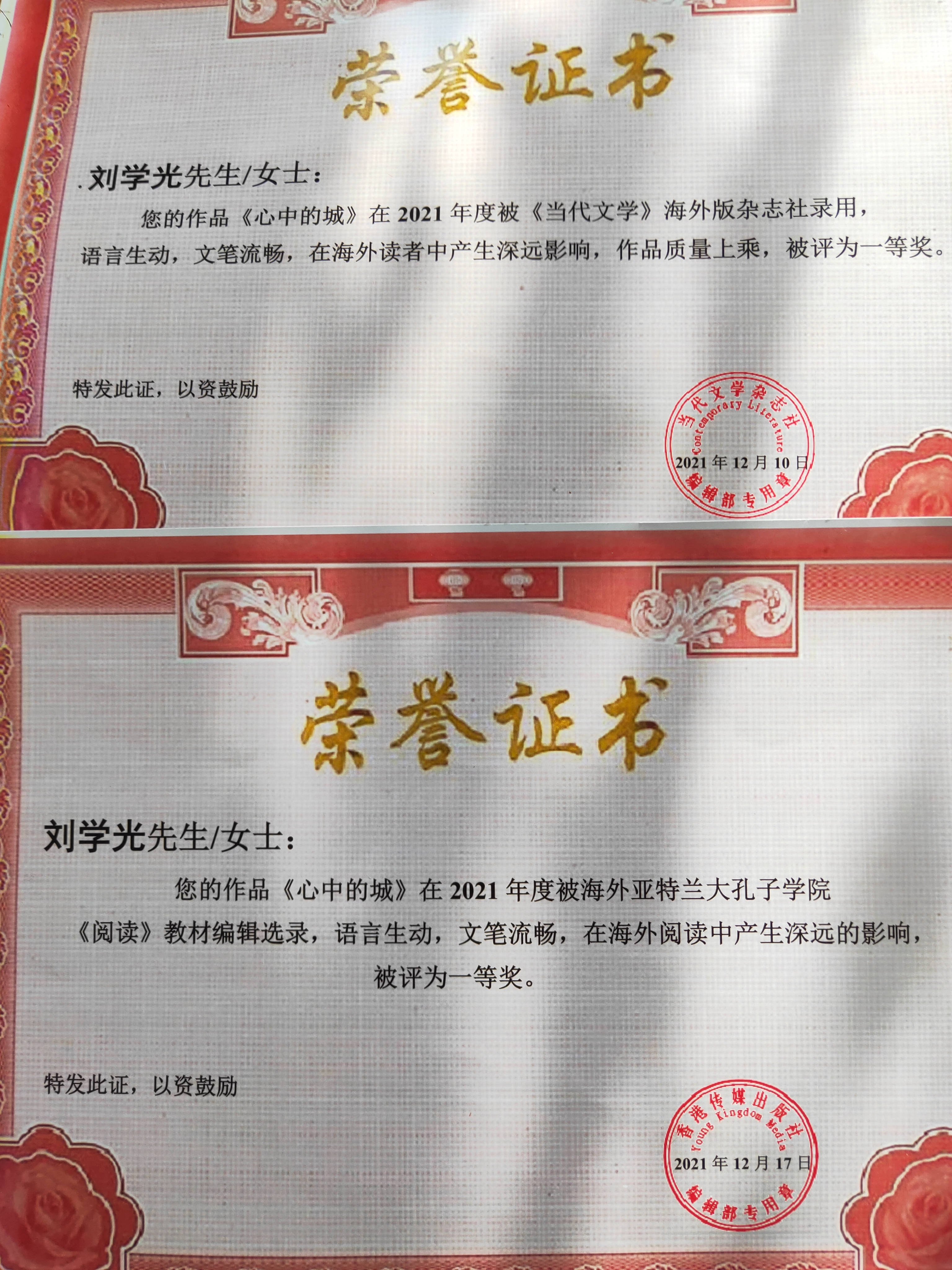 我浏览学光这些年发表的散文作品,犹如天仙撒花,遍及各级各类报刊,令人眼花缭乱,美不胜收。特别引人注目的是收入2022年海外孔子学院阅读教材《阅读》中的《心中的城》和《一棵有灵魂的树》,其中《心中的城》同时刊发在《当代文学》海外版,进入海外读者的视野,可谓“红杏出墙”。还有《那年燕来》被收入《中国青年作家年鉴2017——2018散文小说卷》,另有4000多字的《雨中的紫薇》刊发在2022年第五期《河南文学》上。以上都称得上学光的代表作,足以反映他的创作水平和艺术风格。