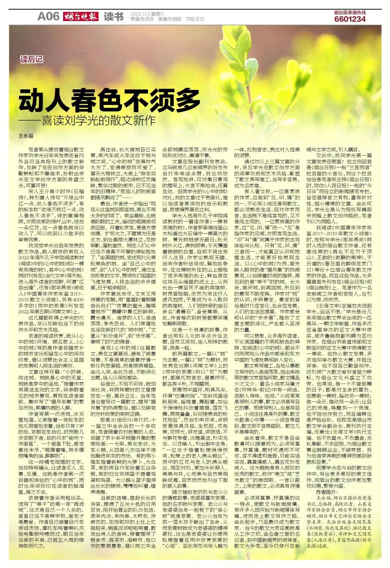 祝愿学光在今后的散文创作中,写出更多更好的美文佳作,祝烟台的散文创作更加繁花似锦,繁荣兴盛。