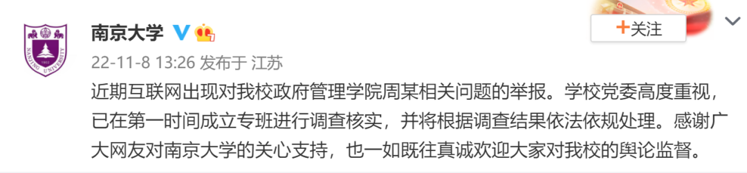 据@南京大学 11月8日消息:近期互联网出现对我校政府管理学院周某相关问题的举报。学校党委高度重视,已在第一时间成立专班进行调查核实,并将根据调查结果依法依规处理。感谢广大网友对南京大学的关心支持,也一如既往真诚欢迎大家对我校的舆论监督。