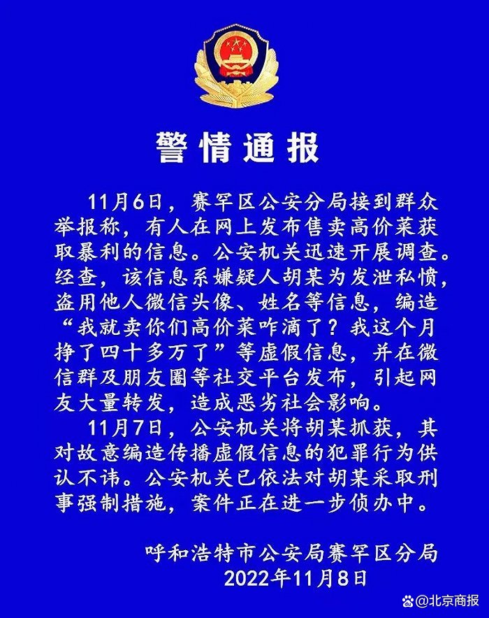 “平安赛罕”微信公众号消息,呼和浩特市公安局赛罕区分局11月8日发布警情通报,11月6日,赛罕区公安分局接到群众举报称,有人在网上发布售卖高价菜获取暴利的信息。公安机关迅速开展调查。