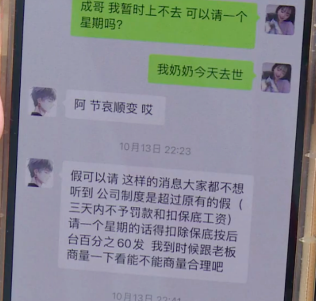 李女士说,7月底找了这份主播的工作,保底工资是4000元,直播时长150小时。“10月11日接到家里的通知,说奶奶病危,12日便向公司请假,公司说让我尽可能在4天内回来,但是第4天的时候,我回来晚了没有去上班,这样就超过了一天。”