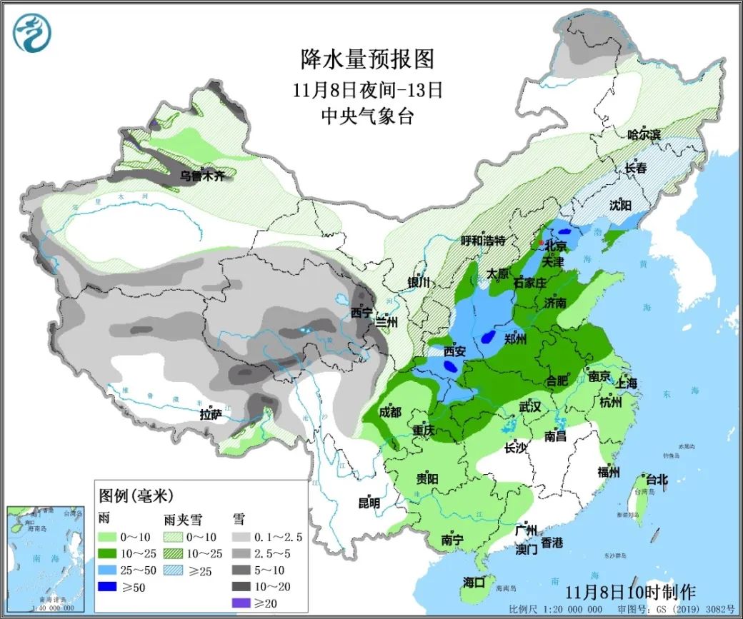 青藏高原以及中东部地区有大范围小到中雨(雪),部分地区有大雨;其中,内蒙古中部和东部偏南地区、河北北部、辽宁中北部、吉林、黑龙江东南部等地部分地区有大到暴雪、局地大暴雪(累计降水量10至25毫米),新增积雪3至8厘米,局地超过10厘米。12日至13日,渤海、黄海、东海等海域有7至8级大风。