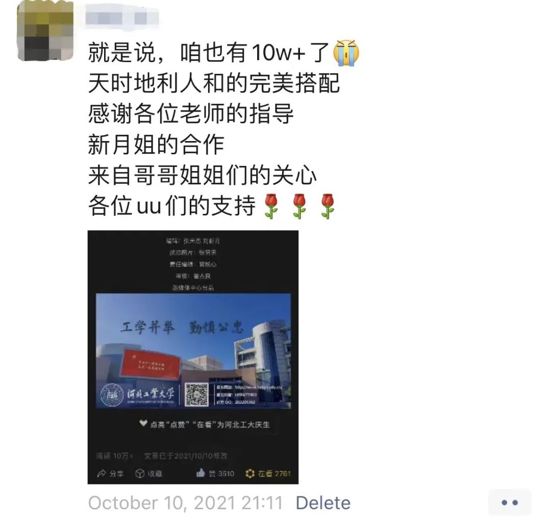 在2021年,我很荣幸能够与融媒体中心再次携手同行,运营了河北工业大学官方抖音账号,这一年,高校抖音经历了一次“改革”,我对运营也从懵懂成长到熟练,和小伙伴们出了一次又一次的任务,收获了经验和友情。