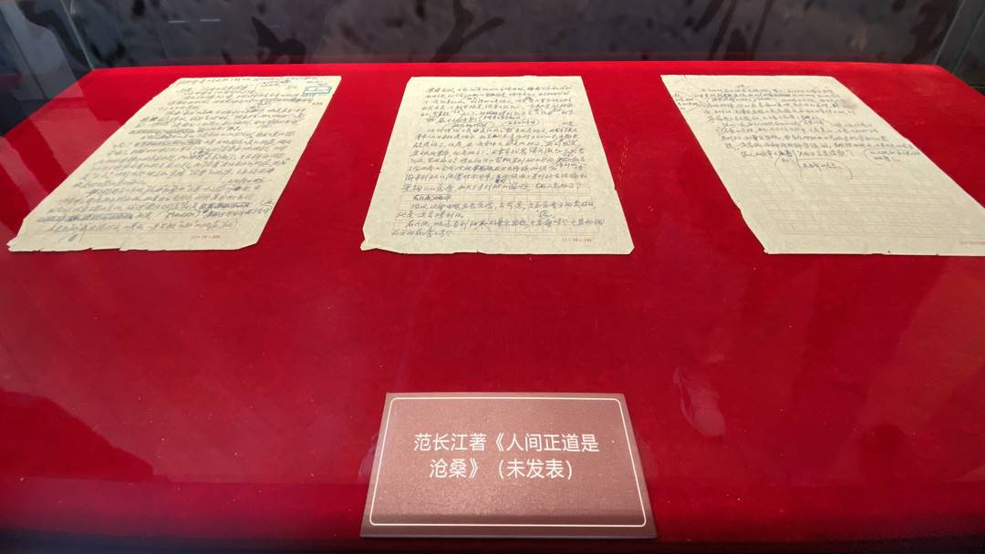展厅内,范长江长子范苏苏捐赠的范长江7篇手稿真迹整齐摆放在玻璃展柜里。这是范长江手稿真迹在全国范围内首次面向公众展出,也是范长江纪念馆开馆13年来首次受赠展出范长江的手迹原件。
