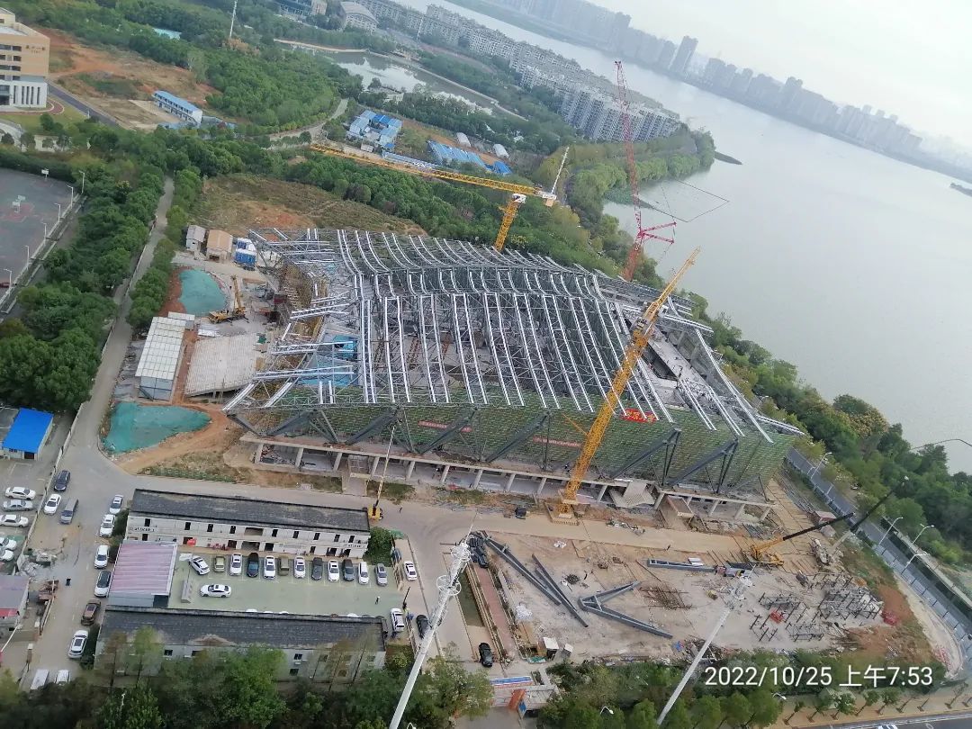 恒大学生文体中心由比赛馆、训练馆和附属配套用房三部分组成,建筑面积约25000㎡,采用“钢框架+钢筋桁架楼承板+大跨度钢桁架屋面”结构形式。