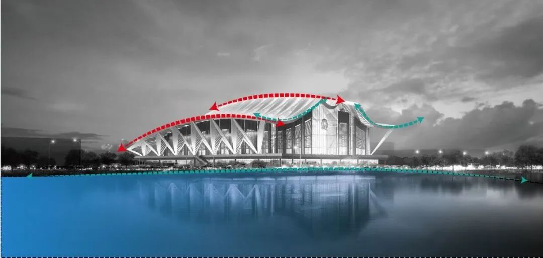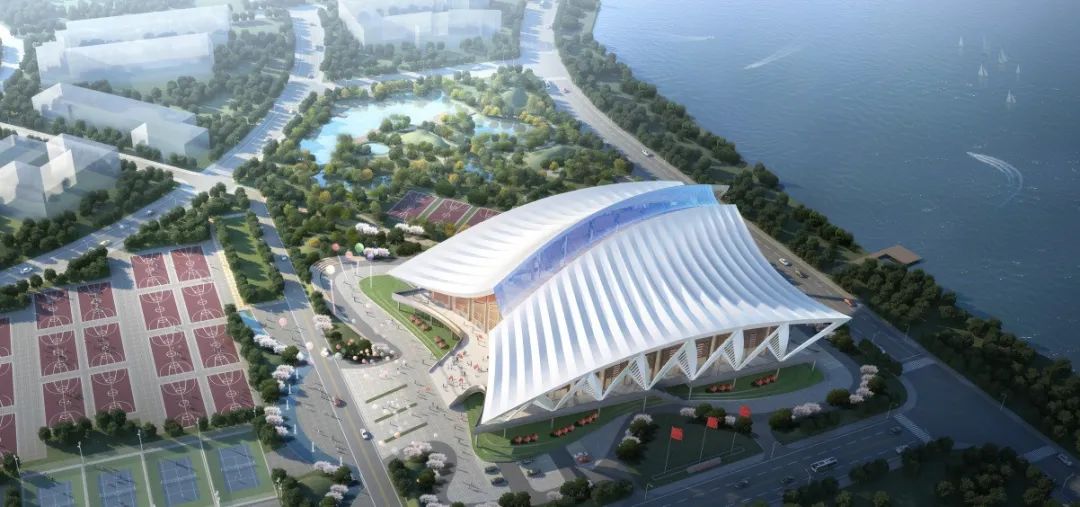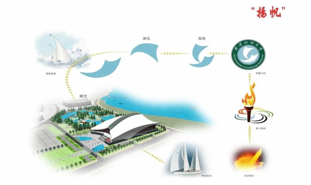 该项目艺术化提炼我校校徽风帆的形态,融入现代化的设计理念,利用新颖的建筑手法,巧妙搭建建筑外形,整体造型似鲲鹏展翅,御风以翔,与沁湖和黄家湖湖景相映成辉。屋面为非对称的三维曲面,屋顶大跨钢结构网不仅张力十足,立面树杈状钢结构更加具有视觉冲击。
