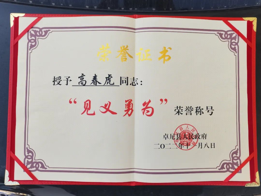 11月8日上午,省公安厅森林公安局洮河分局卡车派出所民警高春虎,收到了由卓尼县人民政府颁发的“见义勇为”荣誉证书。