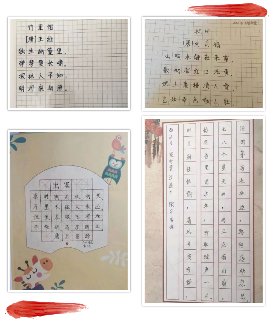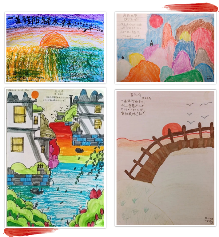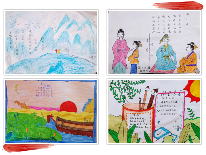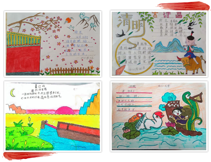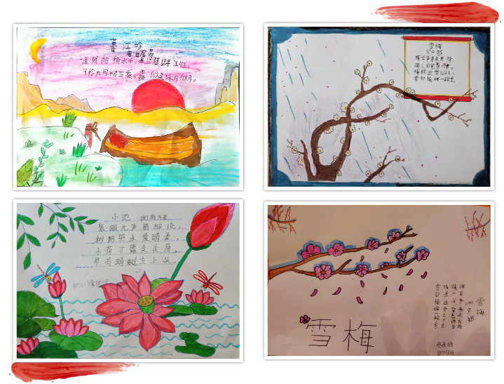 活动开展以来,同学们热情高涨、积极参与。他们以对中华传统文化的热爱为底色,充分发挥自己的想象力,运用平时的语文功底,生动可爱的“咏鹅”、墙角不畏严寒的“梅花”、翠绿的荷叶上时不时有蜻蜓驻足……孩子们笔下一个个经典诗词与绘画相结合,用手中的画笔描绘心中的传统文化。