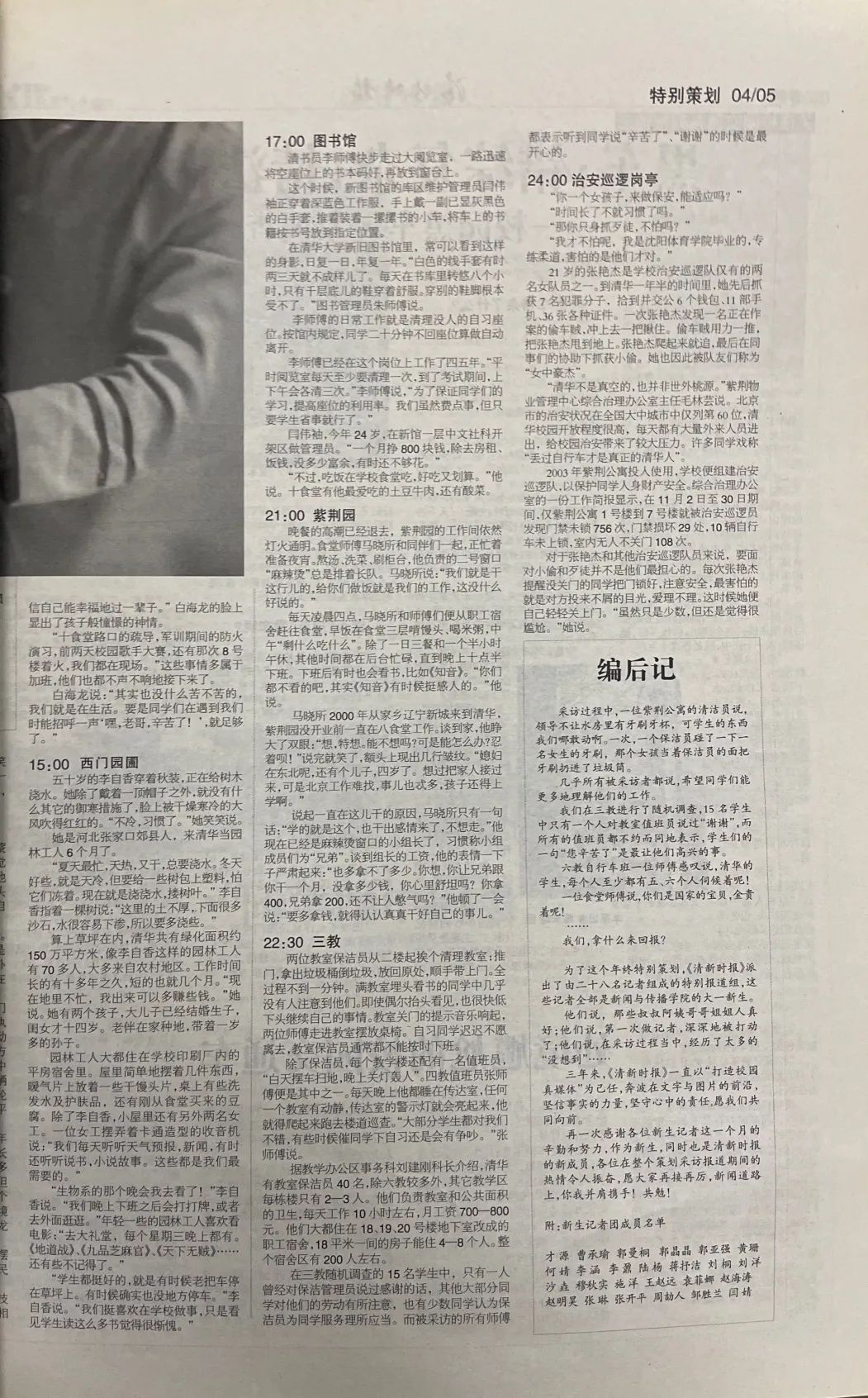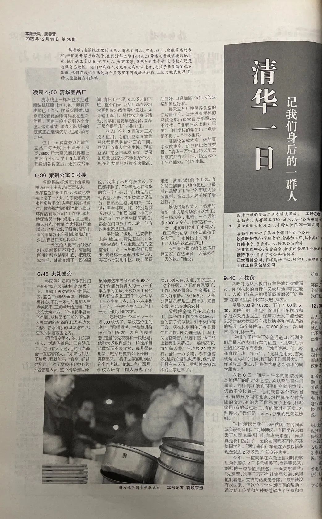 《清华一日》是当年我们带领大一新生记者团完成的一篇稿子,是一个关于“相互理解”的故事。仅仅大三的我们,煞有其事的带领着二十多名师弟师妹们完成了这篇当年我们心目中的鸿篇巨制,自认为是勾勒出了清华服务人员的众生态。