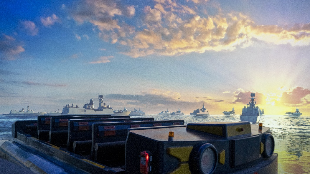 项目采用大型虚拟数字影像,运用直幕、纱幕、弧幕、碗幕和建筑等多种荧幕形式,以高清影像技术实现了对水上虚拟体验视觉场景创新构建,在仿真道具、表演机器人和特技特效加持下,建立了增强式虚拟体验空间。同时,真正突破了多种表演特技与多样影像展示方式融合难的技术关卡,实现了动感游船在虚拟空间中的全程可控,游船与虚拟体验空间融为一体,打破时空限制,为游客营造了可多维度感知的沉浸式海战体验场景,全景演绎了中华民族百余年来走向海洋、努力建设海洋强国的伟大奋斗历程。