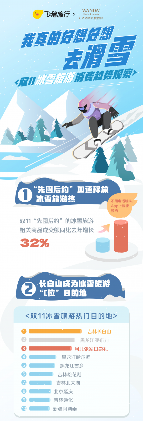 “6月以来,我们就和飞猪一起为冰雪旅游进行预售蓄水,可以说双11达到‘囤货’高峰。”王鑫介绍,“除了长白山的滑雪酒店通兑套餐成为大热门外,北京周边七山万达锦华度假酒店滑雪套餐这一新品销量也不错。”