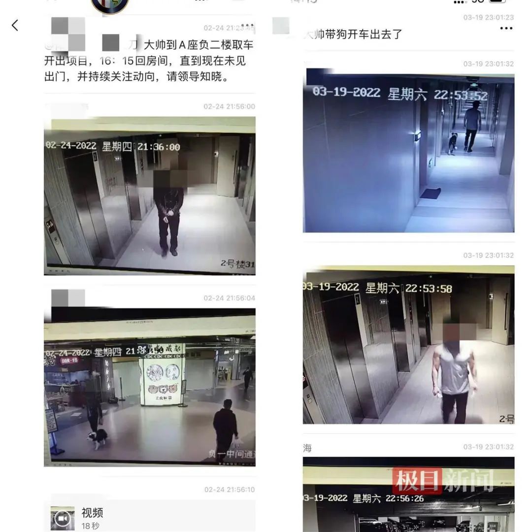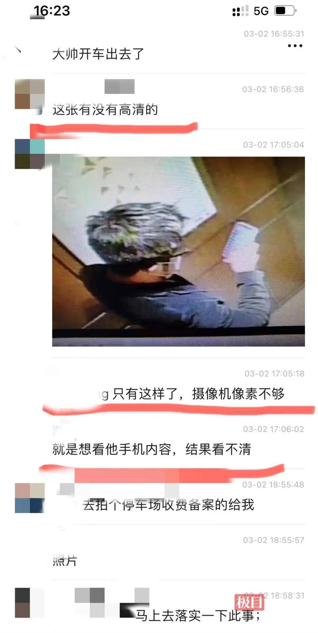 刘越提供的微信群直播内容显示,2022年2月24日晚,有人在群中汇报称“大帅到A座负二楼取车出小区,16:15回房间,直到现在未见出门,并持续关注动向,请领导知晓”;2022年3月2日下午,有人在群里询问,监控中大帅看手机的画面有没有高清图,另一人答复“摄像头像素不够,就是想看他手机内容,结果看不清”。