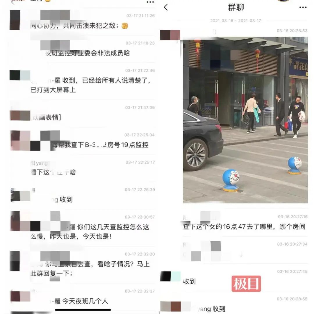 2017年,赵梅考察发现该小区地段不错,周边交通、生活也便利,便买了两套房用来投资和居住,偶尔会和家人一起来住上十天半个月。赵梅称,她经过调查才得知自己被物业监控。她进出小区、吃饭逛街、有家人来访,物业都会通过监控拍下视频、照片发在工作群里,“包括我的房号,我的名字,经常会在群里被议论、调侃。”