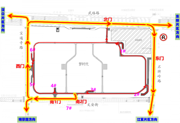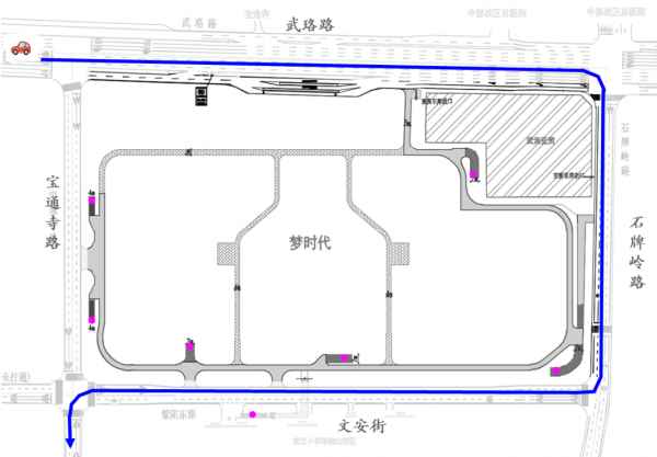 将梦时代周边道路组织设置为顺时针单向通行,即石牌岭路(武珞路-文安街)由北向南、文安街(石牌岭路-宝通寺路)由东向西、宝通寺路(文安街-武珞路)由南向北单向通行。