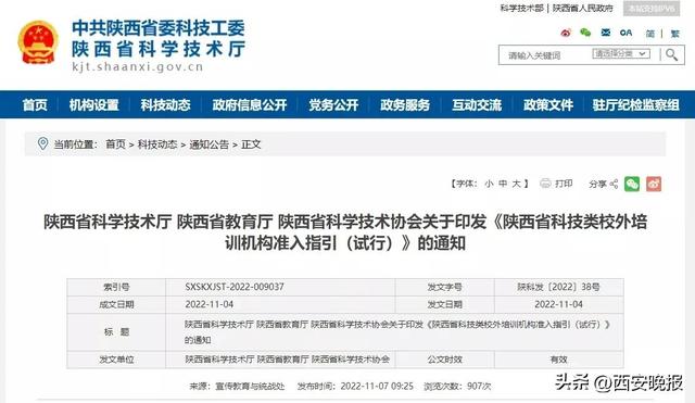 11月7日,记者从省科技厅获悉,为进一步规范我省科技类校外培训机构,促进校外培训市场健康有序发展,结合我省实际,陕西省科学技术厅、陕西省教育厅、陕西省科学技术协会印发《陕西省科技类校外培训机构准入指引(试行)》,从准入登记、组织机构、培训内容、师资队伍、办学场所等多方面提出明确规定,全面有序规范非学科类校外培训机构发展,积极引导其成为学校教育的有益补充。