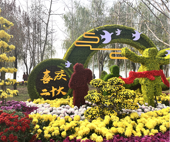 “请佩戴好口罩、注意个人防护。”展区严格落实疫情防控措施,游园广播里循环播放着防疫提示,前来观展的市民佩戴口罩有序参观,他们或弯腰欣赏,或驻足拍照,还有不少市民约上好友一起拍抖音。“欢庆二十大、永远跟党走”这一主题造型前面,喜庆欢乐的氛围格外浓厚,一团团、一簇簇、一片片的精美菊花营造出花开锦绣、繁华遍地的极致美景,给市民带来一场视觉“盛宴”。在“编钟”造型的花柱上,“神韵随州、国泰民安”的字样镶嵌其中,吸引了众多市民前来打卡拍照。