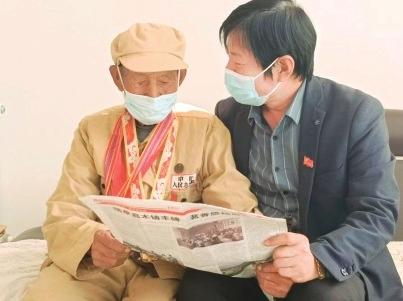 11月4日,莒县库山乡彩山村党支部书记宋时伟,专门来到村里95岁的老党员宋维吉家中,宣讲党的二十大精神。