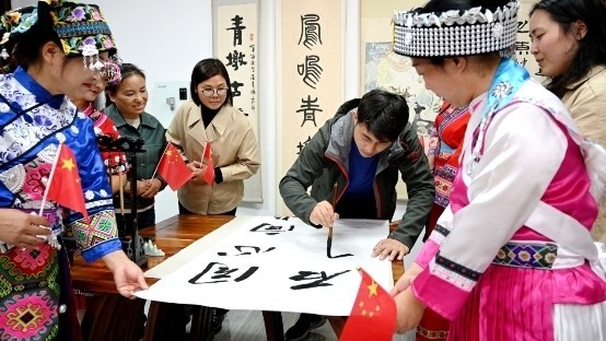11月7日 ,江苏省南通市海安市南莫镇“石榴花开 同心向党”民族之家组织各民族参观非遗展馆,民族代表亲身体验、感受书画、剪纸等中华民族传统文化,铸牢中华民族共同体意识。