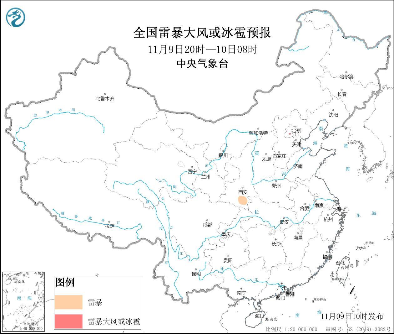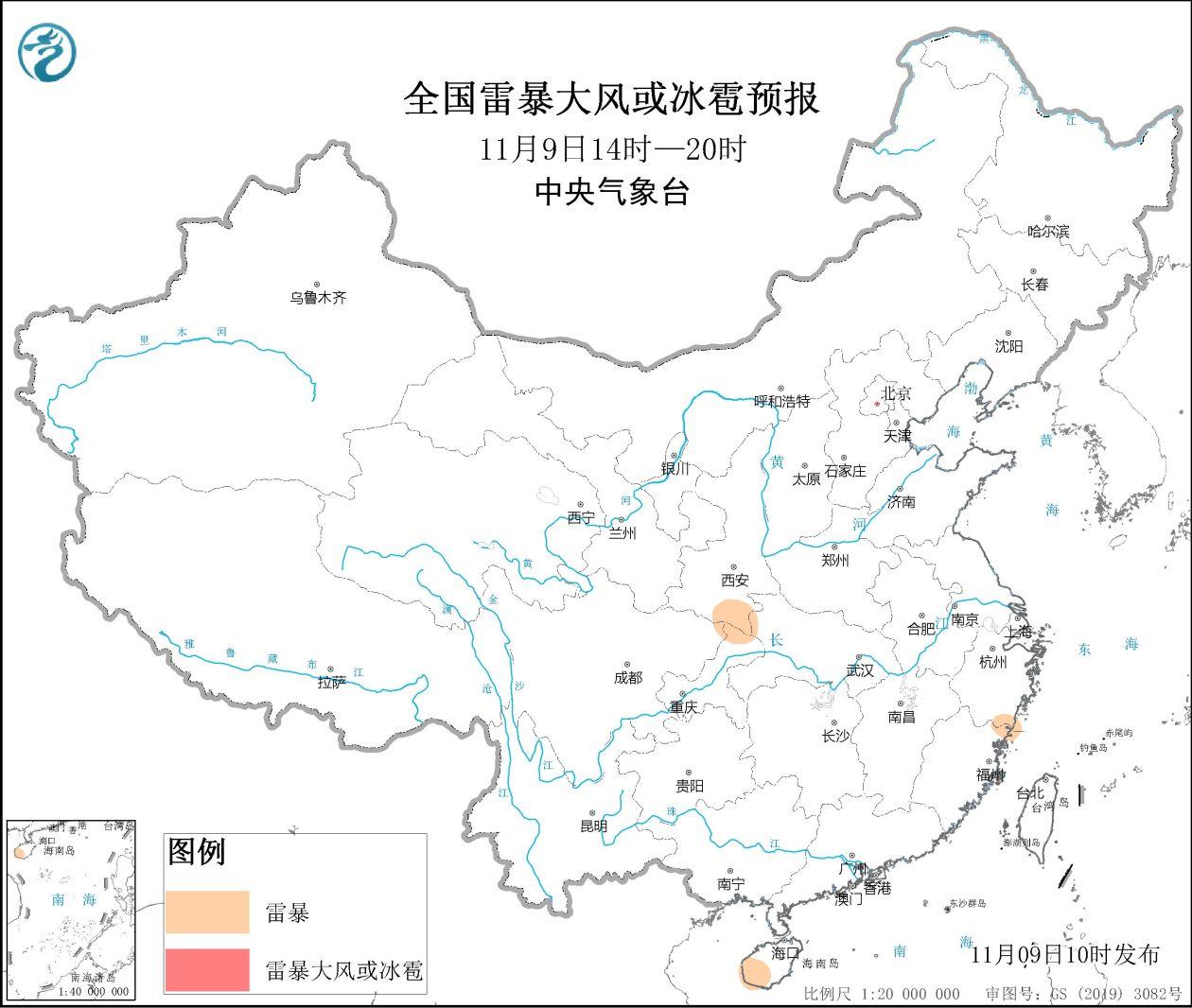 预计11月9日14时至10日08时,陕西南部、浙江南部、福建东北部、海南岛中西部等地的部分地区将有雷暴天气。