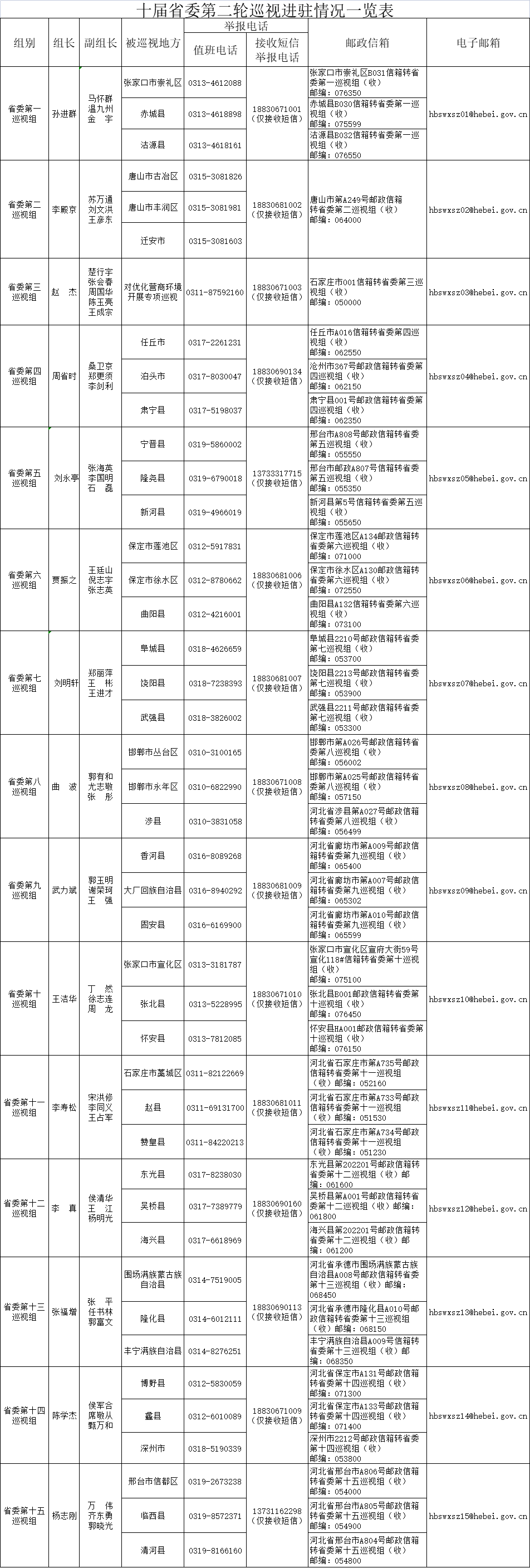经省委批准,十届省委第二轮巡视14个常规巡视组,对石家庄市藁城区、赞皇县、赵县,围场满族蒙古族自治县、隆化县、丰宁满族自治县,张家口市崇礼区、宣化区、张北县、赤城县、沽源县、怀安县,唐山市古冶区、丰润区、迁安市,香河县、大厂回族自治县、固安县,保定市莲池区、徐水区、曲阳县、博野县、蠡县,东光县、吴桥县、海兴县、肃宁县、任丘市、泊头市,饶阳县、阜城县、武强县、深州市,邢台市信都区、临西县、新河县、宁晋县、清河县、隆尧县,邯郸市丛台区、永年区、涉县等42个县(市、区)开展常规巡视;省委优化营商环境专项巡视组按照省委批准的专项巡视工作方案全面展开工作。