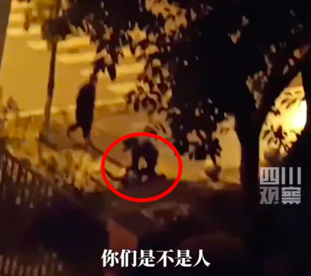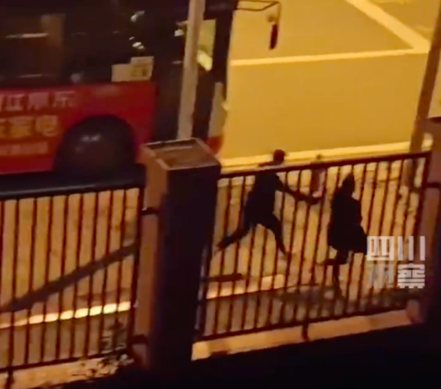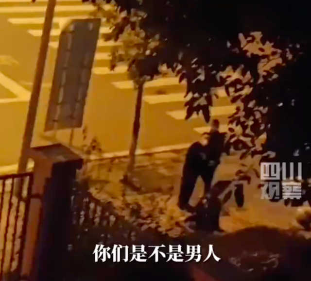 视频画面显示,两名男子在深夜追赶一女子,墙内的一群男学生齐声高喊;“你要做啥子!”随后女子被一名男子推倒在地,同学们见状大喊:“保安保安!你还是不是男人?动一下试试!”