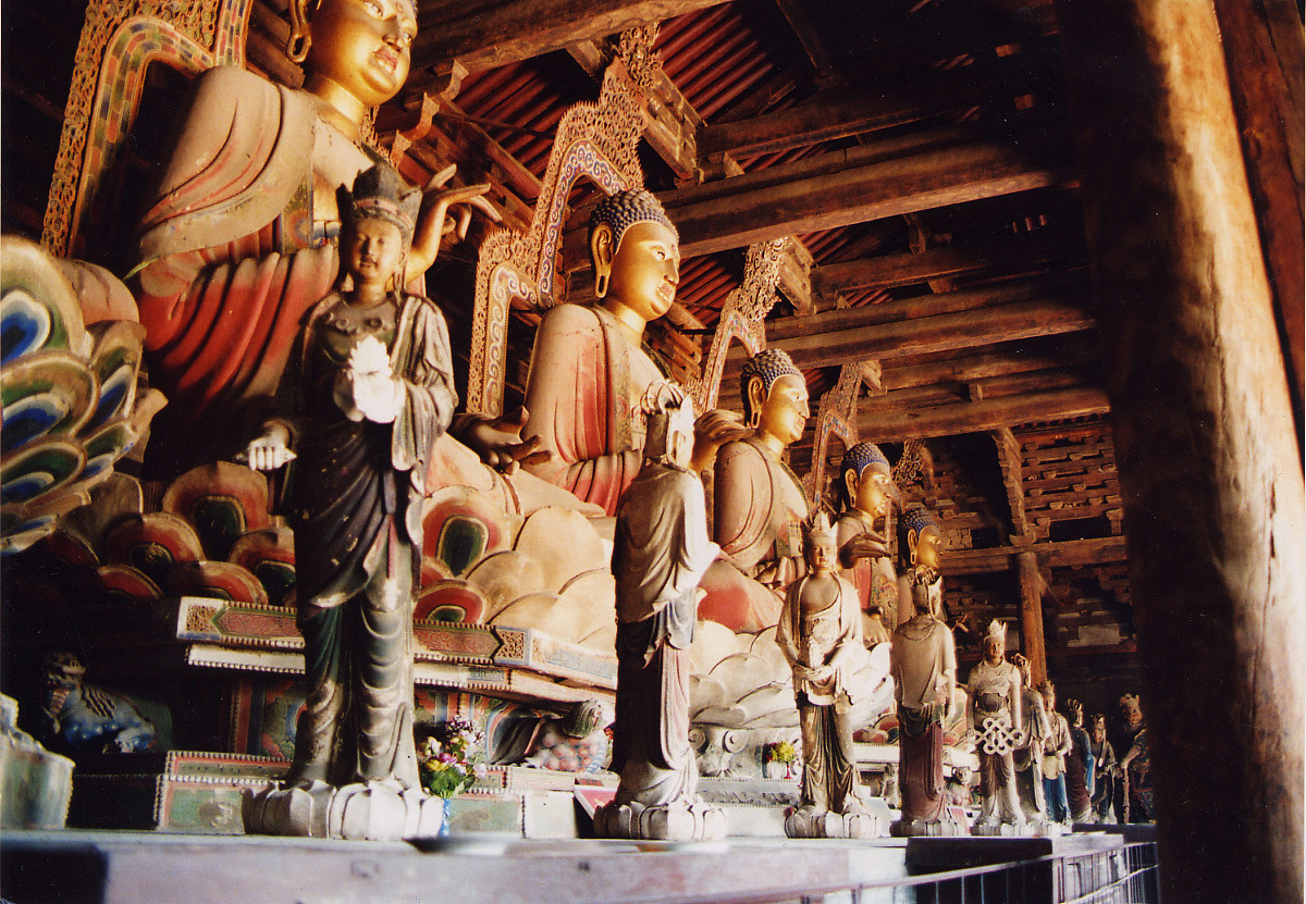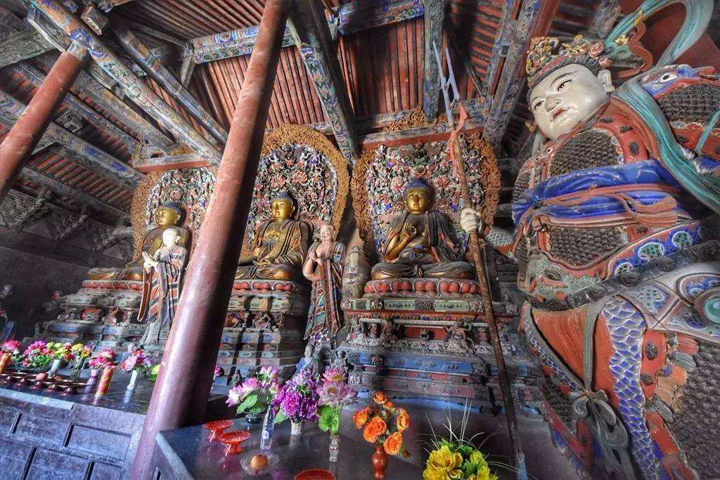 云林寺在阳高县城云林路的县文物管理所内,这座明代寺院至今还遗存前院的山门和钟楼,以及后院的天王殿和大雄宝殿,其中仅有大雄宝殿为明代原物,而云林寺的参观亮点也都集中在这座五间四进单檐庑顶的大殿内,也就是被称为云林寺三绝的悬塑、彩塑和壁画,尤其是东、西壁上被称为“法界水陆普度大斋胜会”的水陆主壁画,两面壁画各分上、中、下三层绘制了共计89组455身神祇,满堂的神仙图谱直追山西永乐宫的朝元图。