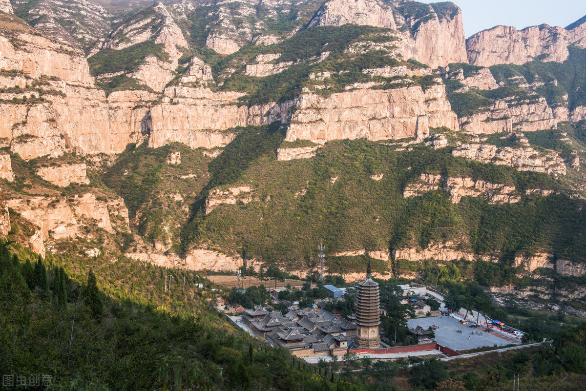 比起前面三座寺庙,灵丘县的觉山寺要稍微偏远一些,它位于距县城十多公里的红石塄乡,沿着五台山脉间的峡谷穿行,首先看到的是高耸在山坳里的觉山寺塔,这座辽代密檐式十三层砖塔高度接近45米,塔身一层内室的木雕卧佛和辽代壁画不对外开放,但光是周身精雕细刻的砖雕就值得逗留一两个小时。觉山寺东侧的寺院建筑多为清代所修,但东中西三进院落门楼殿阁齐全,远观寺庙背后的山腰还可见一座“如假包换”的悬空寺。