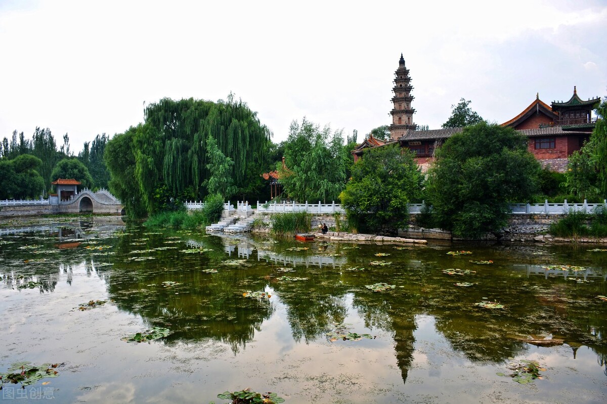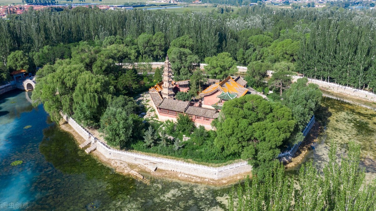 与上面四座寺庙不同的是,这座位于广灵县城南的明创清建水神堂并非传统意义上的佛教寺庙,首先整个建筑群坐落于壶泉湖中央地势略高的岛上,仅通过南边的石桥与外界相通。其次主体建筑为九江圣母殿与观音殿两殿合体,主祀的水神九江圣母在传说中曾化身龙母镇水斗法,为一方百姓争得甘泉霖雨。岛上东北隅的灵应宝塔通高17.5米,为仿木结构的六角形清代砖塔,在前来水神堂的路上很远就能望到。水神堂四季可游,尤其夏季满湖的荷花给人以清凉之感。