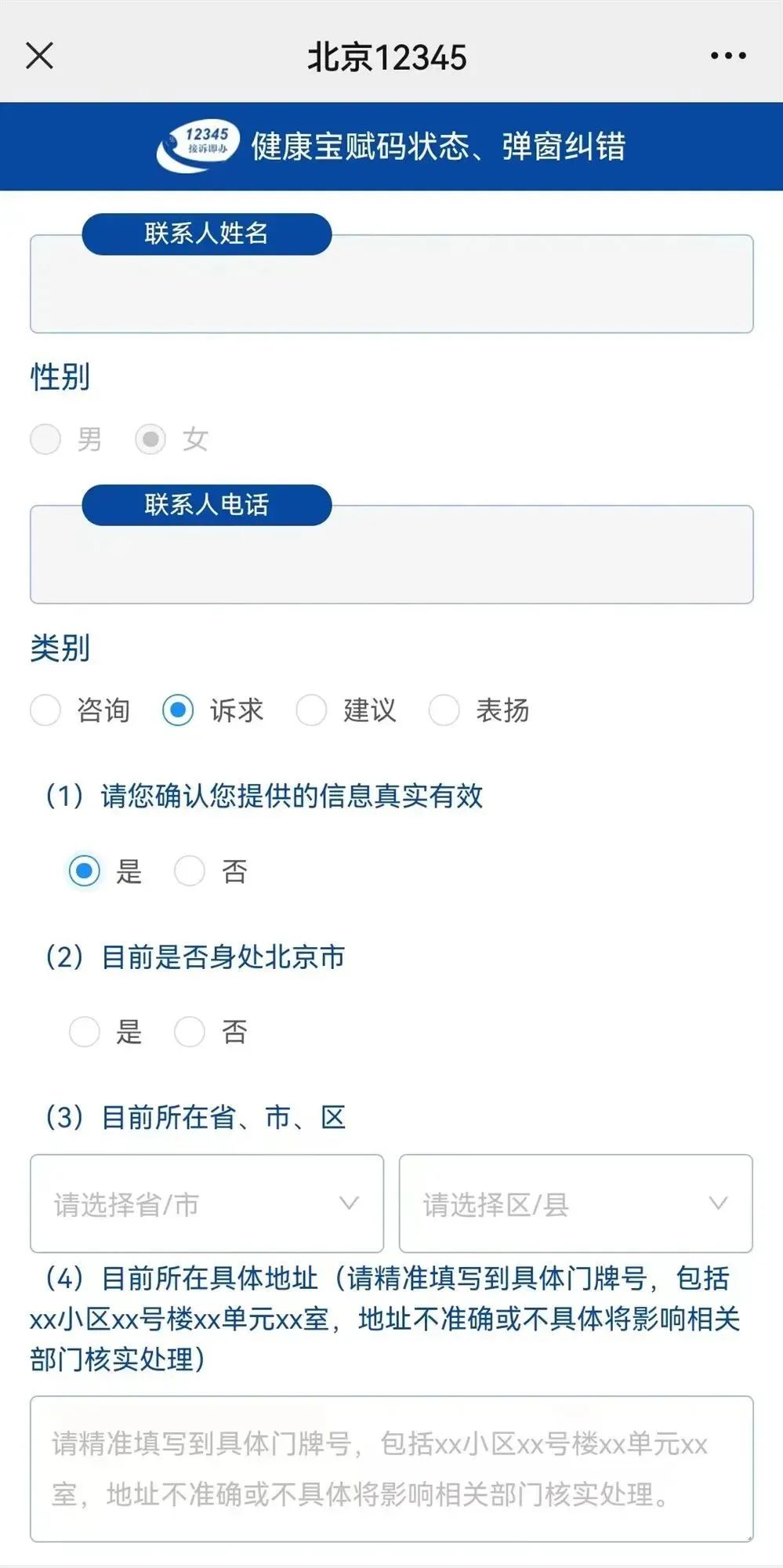 若您在京外,请通过“北京12345”微信公众号民意直通-健康宝赋码状态、弹窗纠错栏目留言(当日提交一次即可,无需重复提交)。