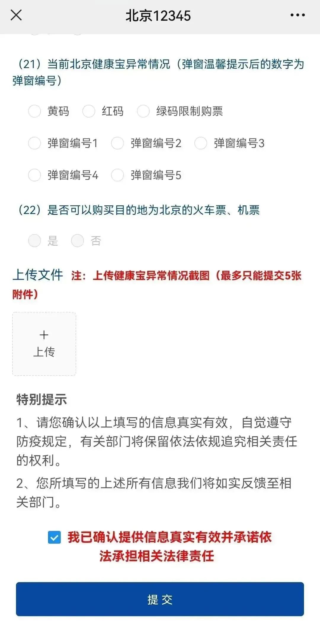 如果您在京外被弹窗无法进返京,请通过“北京12345”微信公众号“民意直通”—“健康宝赋码状态、弹窗纠错”填报信息,北京12345会及时响应办理,最大限度减少对市民群众正常生产生活的影响。