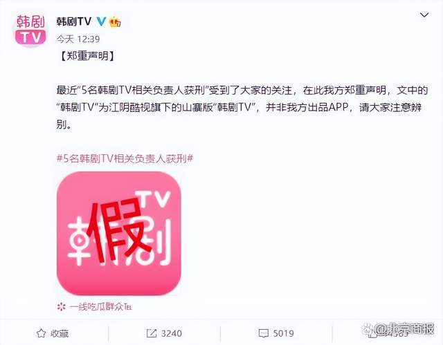 11月9日,韩剧TV官方微博郑重声明称,文中的“韩剧TV”为江阴酷视旗下的山寨版“韩剧TV”,非韩剧TV出品APP。