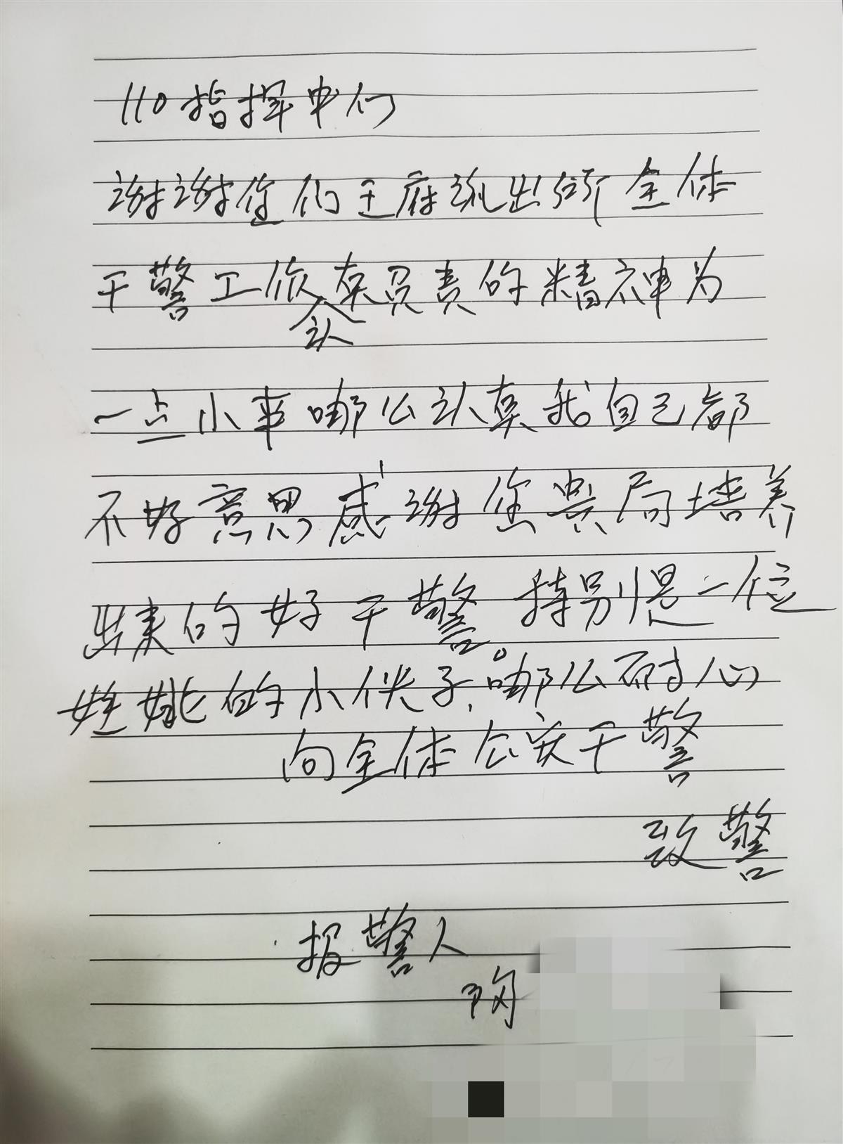 “70多了,记性不好,没想到民警同志这么尽职尽责,谢谢你们!”陶奶奶握着民警的手连声道谢,并在接处警大厅手写了一封感谢信交到民警手中。