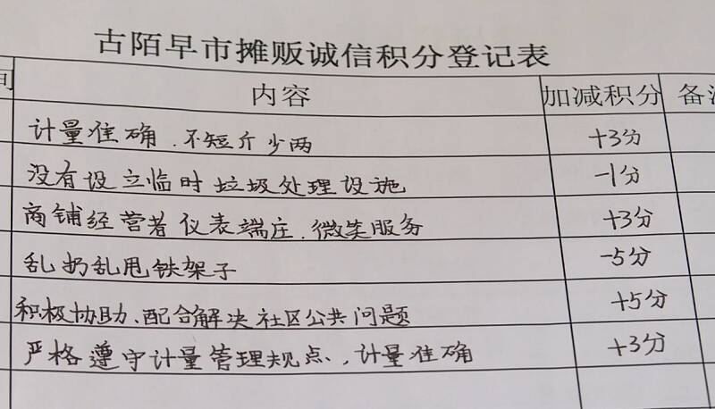 鲸园街道古陌社区党总支书记 徐晓红说:“社区党组织牵头,联合祥云物业、小巷管家、居民骨干一起摸排居民、摊主诉求,掌握市场的底数,有的放矢进行整改提升,协商制定了早市商家的诚信赋分标准,与早市摊主签订了300多份诚信承诺书,建立了一摊主一档案,定期公示积分情况。”