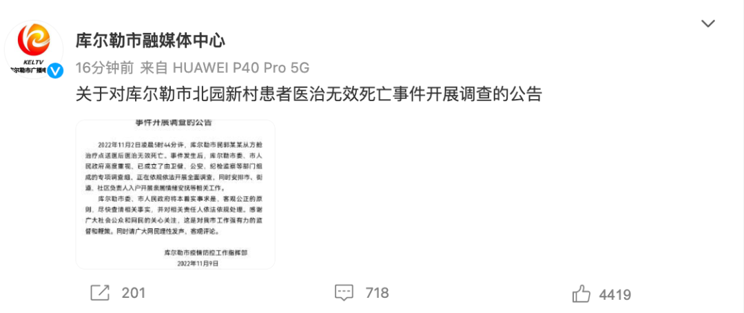 事件发生后,库尔勒市委、市人民政府高度重视,已成立了由卫健、公安、纪检监察等部门组成的专项调查组,正在依规依法开展全面调查,同时安排市、街道、社区负责人入户开展亲属情绪安抚等相关工作。库尔勒市委、市人民政府将本着实事求是、客观公正的原则,尽快查清相关事实,并对相关责任人依法依规处理。
