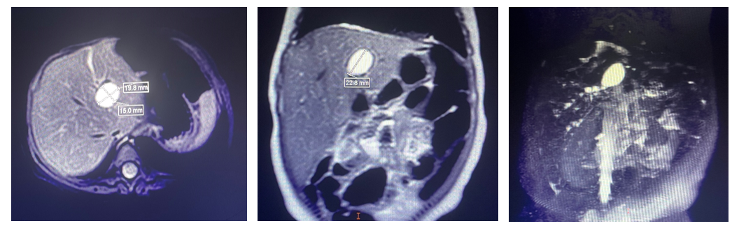 二次手术前MRI、MRCP结果:肝门区见类圆形异常信号灶;右侧见多个小圆形异常信号灶