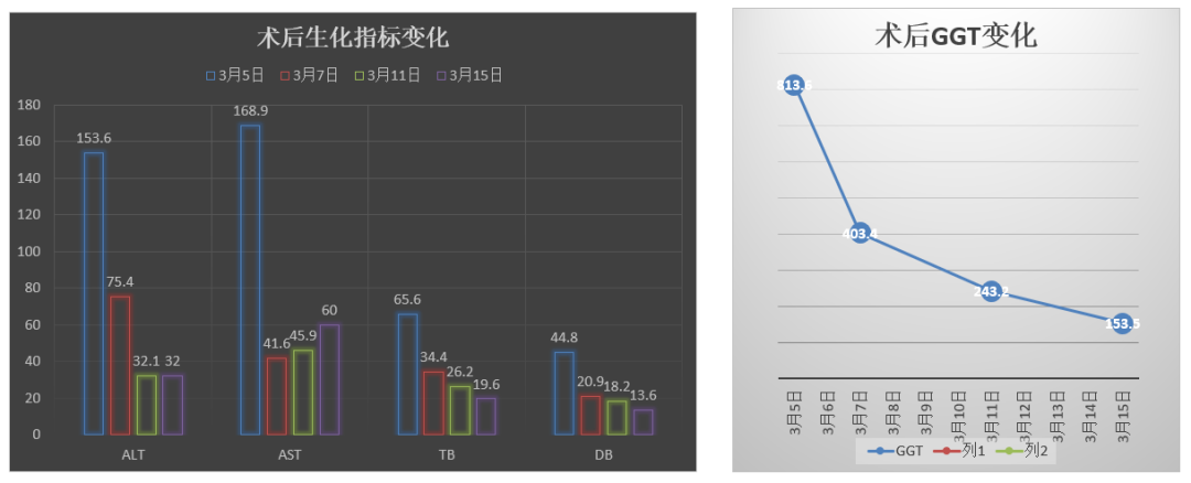 术后生化指标变化,ALT:谷丙转氨酶(U/L),AST:谷草转氨酶(U/L),TB:总胆红素(ummol/L),DB:直接胆红素(ummol/L);GGT:谷氨酰转肽酶(U/L)