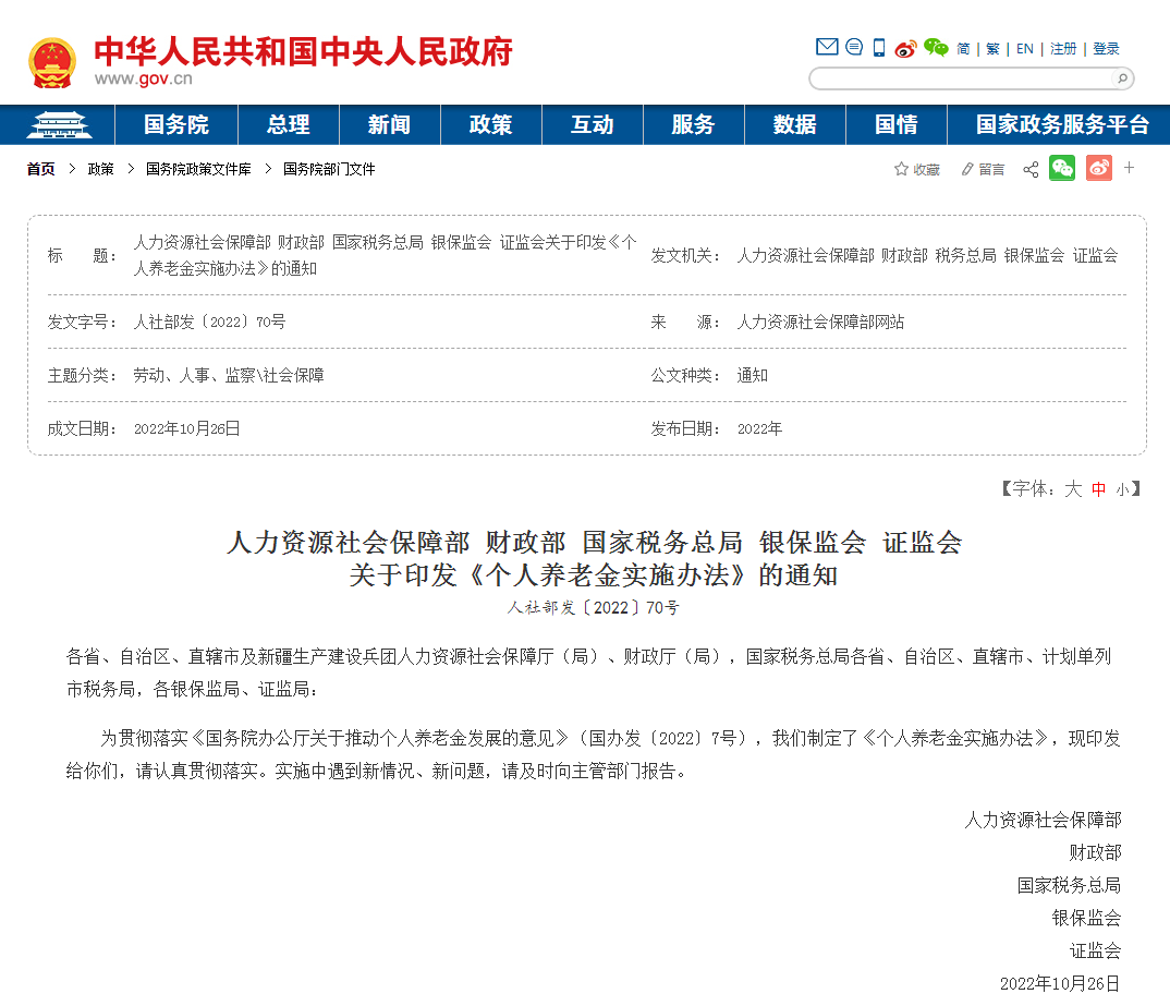 近日,人力资源社会保障部、财政部、国家税务总局、银保监会、证监会联合印发《个人养老金实施办法》(人社部发〔2022〕70号)。个人养老金是政府政策支持、个人自愿参加、市场化运营的补充养老保险制度。在中国境内参加城镇职工基本养老保险或者城乡居民基本养老保险的劳动者,都可以参加。