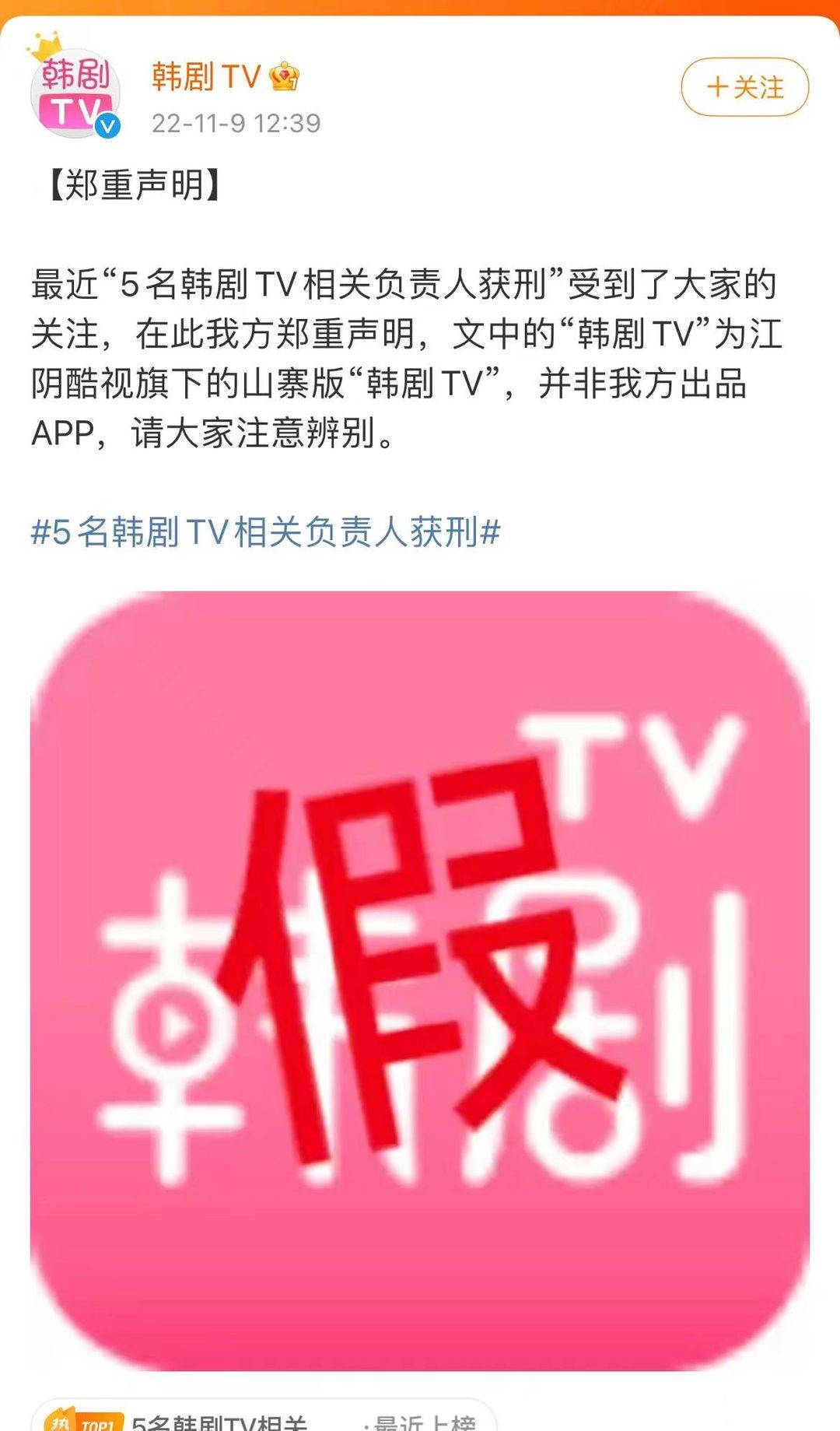 值得注意的是,当天,微博名称为“韩剧TV”的账号发布声明称最近“5名韩剧TV相关负责人获刑”的消息,文中的“韩剧TV”为江阴酷视旗下的山寨版“韩剧TV”,并非我方出品APP,请大家注意辨别。