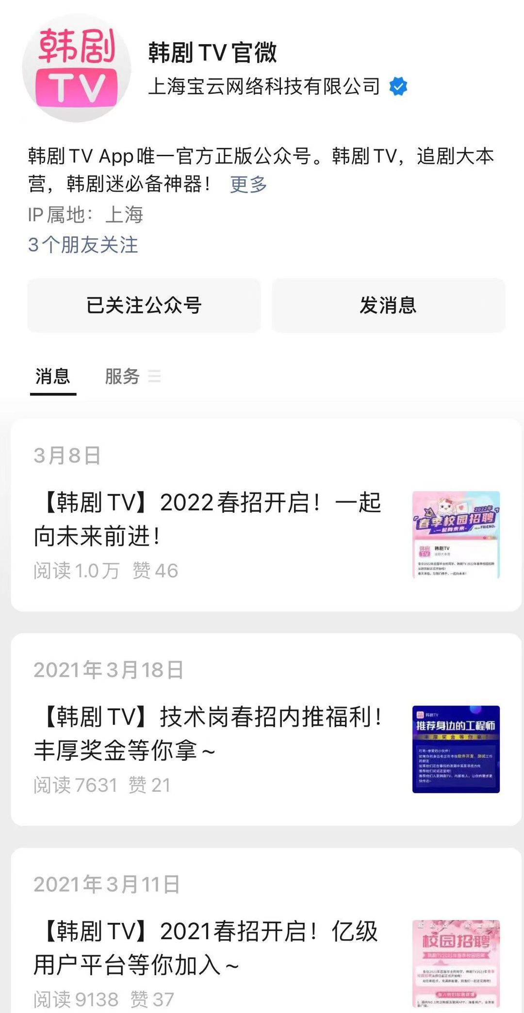 记者注意到,“韩剧tv”官方公众号曾在2020年和2021年发布过关于招聘剪辑和运营工作人员的公告,也曾发布一些韩剧的相关内容。目前,最新的推文日期是在今年3月8日。