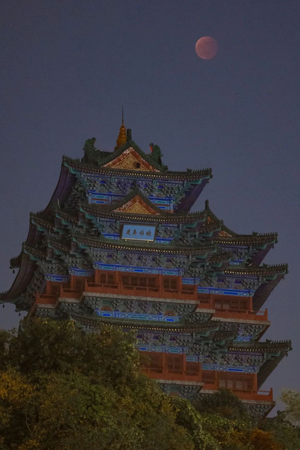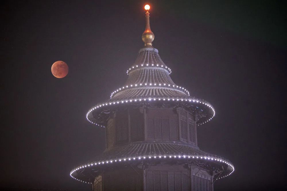 这是11月8日在江苏扬州文昌阁附近拍摄的月食。新华社发(齐立广摄)