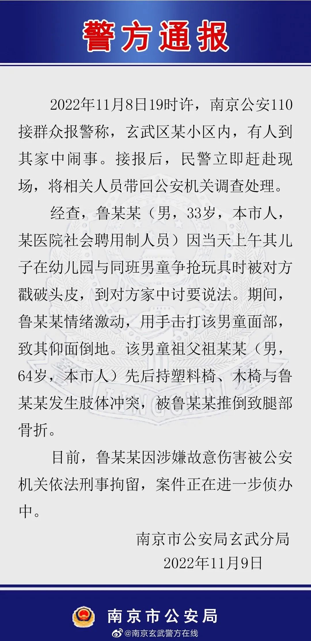 11月8日19时许,南京公安110接群众报警称,玄武区某小区内,有人到其家中闹事。接报后,民警立即赶赴现场,将相关人员带回公安机关调查处理。经查,33岁的某医院社会聘用制人员鲁某某,因当天上午其儿子在幼儿园与同班男童争抢玩具时被对方戳破头皮,到对方家中讨要说法。期间,鲁某某情绪激动,用手击打该男童面部,致其仰面倒地。该男童祖父64岁的祖某某先后持塑料椅、木椅与鲁某某发生肢体冲突,被鲁某某推倒致腿部骨折。目前,鲁某某因涉嫌故意伤害被公安机关依法刑事拘留,案件正在进一步侦办中。