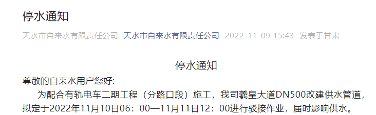 为配合有轨电车二期工程(分路口段)施工,我司羲皇大道DN500改建供水管道,拟定于2022年11月10日06:00—11月11日12:00进行驳接作业,届时影响供水。