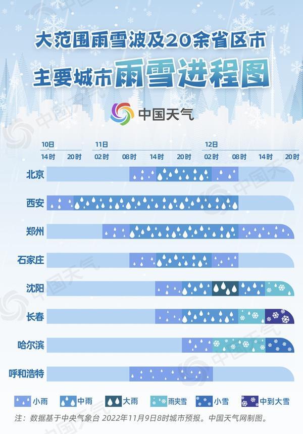 大城市中,东北三个省会级城市都可能出现降雪,长春和哈尔滨或将迎今冬初雪,初雪时间较常年(10月下旬)明显偏晚。其中,长春降雪最为明显,请大家及时关注临近预报。北京北部和西部山区也可能会飘雪,城区以小到中雨、局地大雨天气为主,核心降水时段为11日白天。